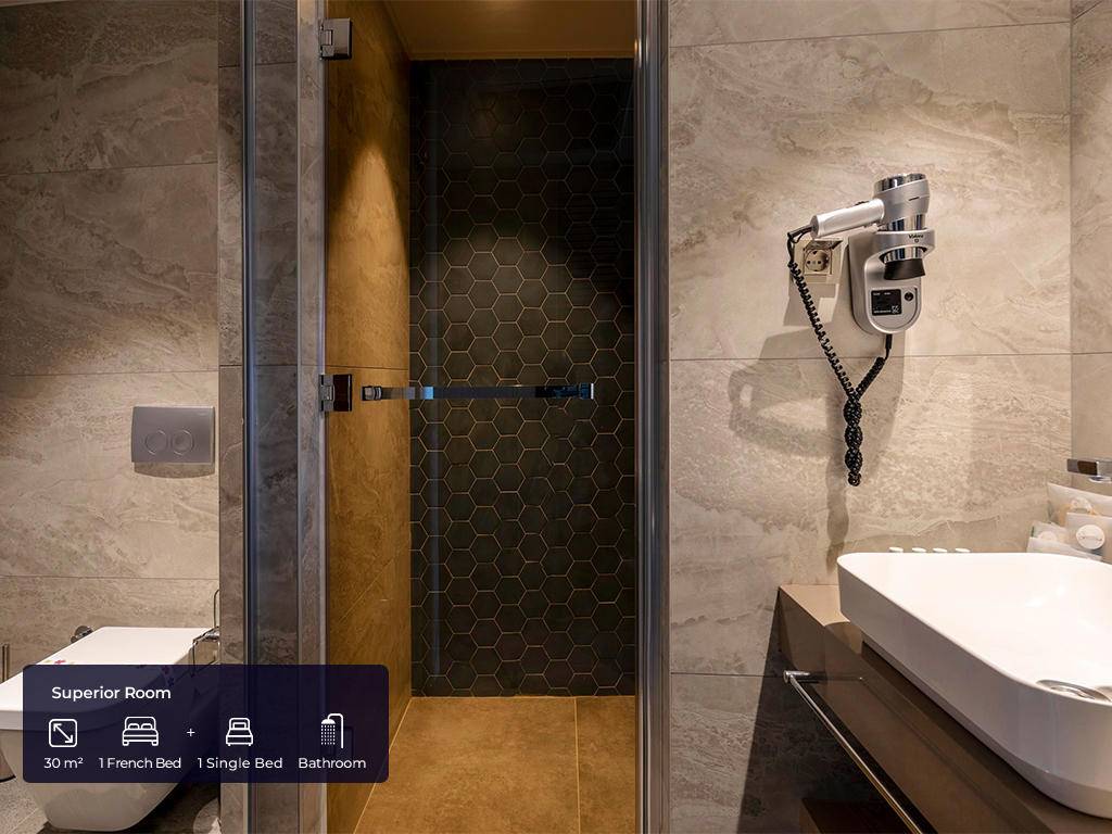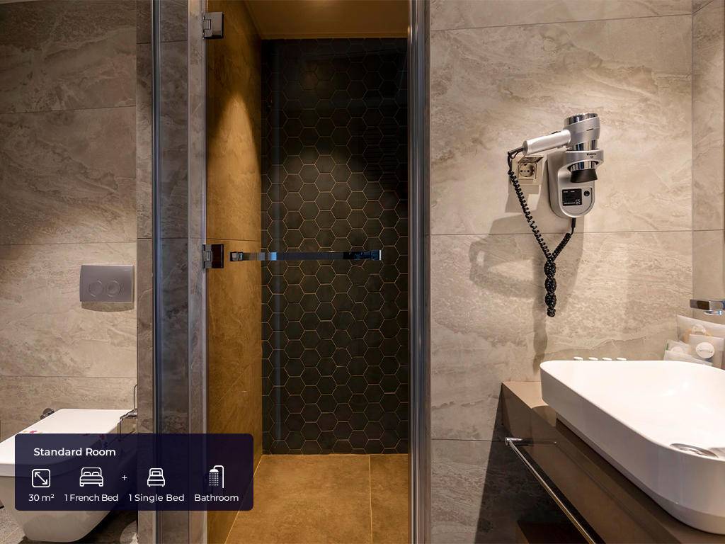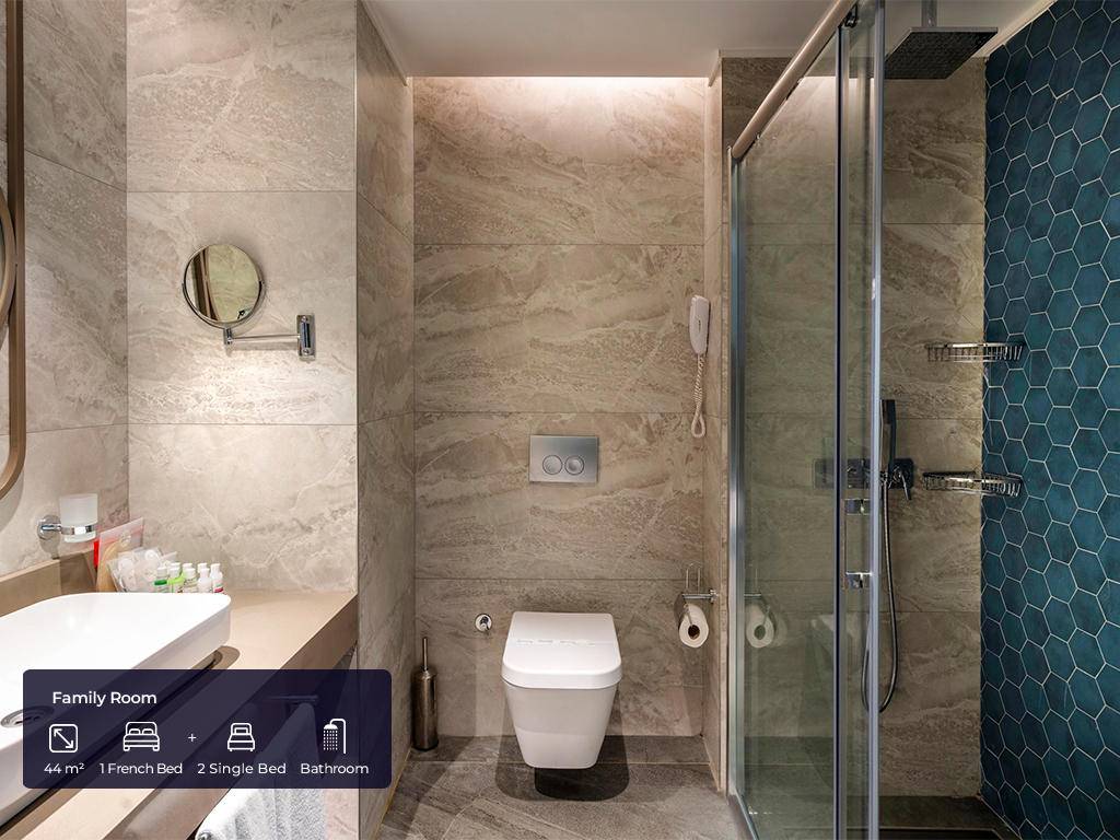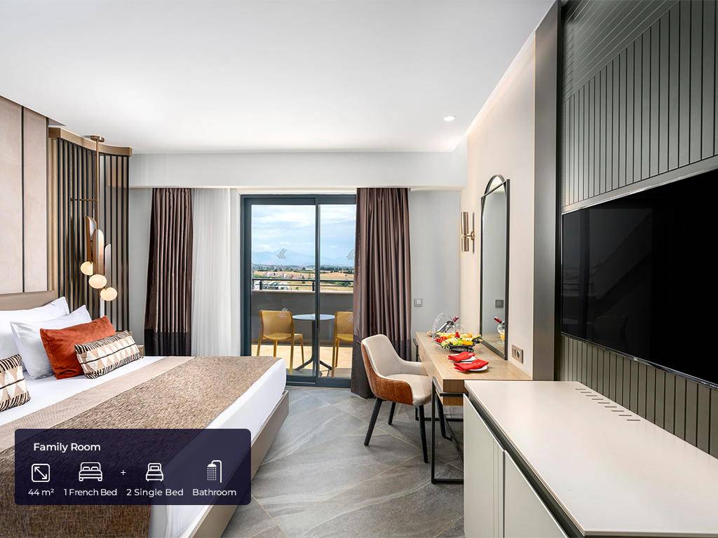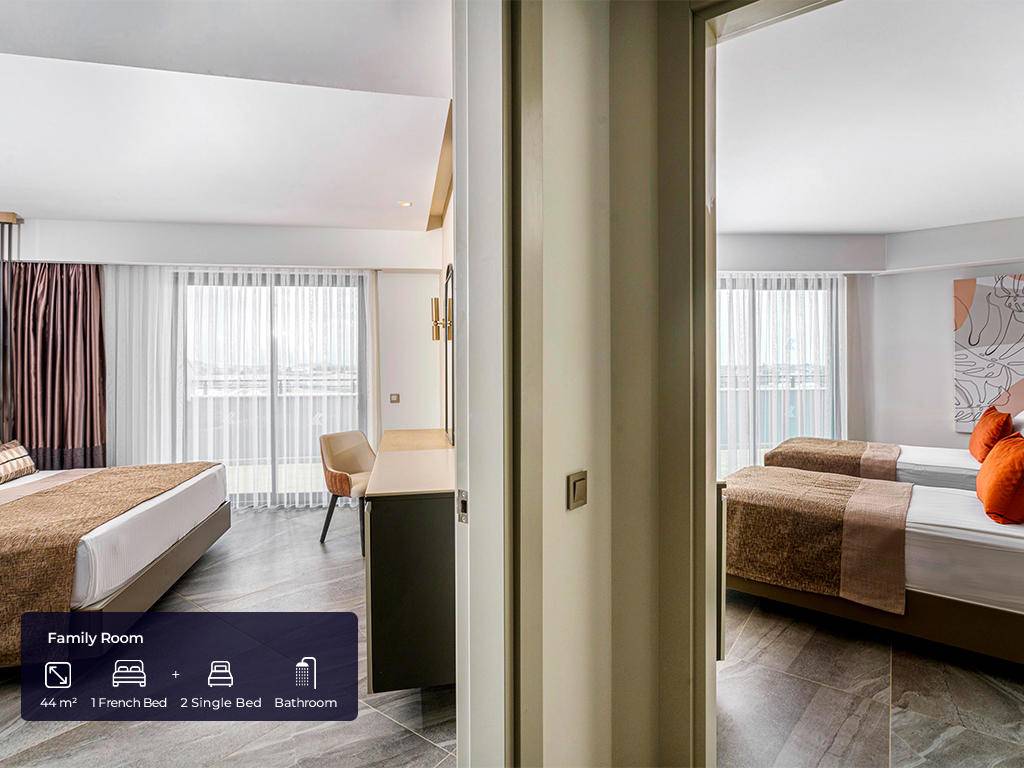 Ukupan broj soba je 420. Standardne sobe (30 m², jedna spavaća soba s francuskim krevetom + jedan single krevet, jedno kupatilo, maksimalno 2 odrasle osobe + 1 osoba), Superior sobe (30 m², jedna spavaća soba s francuskim krevetom i jednim single krevetom, jedno kupatilo, maksimalno 3 odrasle osobe + 1 osoba), Porodične sobe (44 m², dvije odvojene spavaće sobe – jedna s francuskim krevetom, druga s dva single kreveta, vrata između, jedno kupatilo, maksimalno 4 osobe), Deluxe porodične sobe (63 m², jedna spavaća soba s francuskim krevetom, druga sa tri single kreveta, jedno kupatilo, maksimalno 4 odrasle osobe + 2 djece). Sve sobe imaju privatno kupatilo s tušem, fen za kosu, ogrtač, papuče, klima uređaj koji radi u određenim satima u zavisnosti od vremenskih uvjeta, mini bar (voda, bezalkoholna pića, pivo, čokolada, čips, koji se svakodnevno dopunjuju), čajnik, set za pripremu kafe i čaja, laminat na podu, sef, satelitsku televiziju i muzičke kanale, balkon. WI-FI internet konekcija (niske brzine) je besplatna.