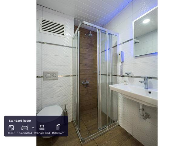Ukupan broj soba je 200 u tri bloka. Standardne sobe pogled more (18m2, jedna spavaća soba sa francuskim ležajem + jedan pomoćni ležaj, jedno kupatilo, max.2+1pax). Sve sobe imaju sopstveno kupatilo sa tuš kabinom, fen za kosu, split klima uređaj, direktnu telefonsku liniju, mini bar (voda se dopunjuje svaki dan), sef (uz doplatu), keramički pod, SAT TV i muzički kanali, balkon.