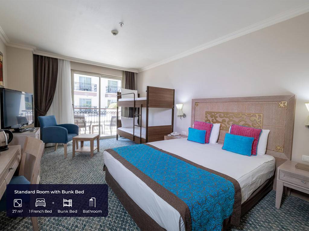 Ukupan broj soba je 372 raspoređenih u četiri petospratne zgrade. Standardne sobe (27m2, spavaća soba s francuskim krevetom, single krevet, kupatilo, max. 3). Standardne sobe s dvospratnim krevetom (27m2, spavaća soba s francuskim i dvospratnim krevetom, kupatilo, max. 2+2 djece). Porodične sobe (40m2, dvije spavaće sobe s vratima između, kupatilo, max. 4). Porodične sobe s dvospratnim krevetom (40 m2, dvije spavaće sobe s francuskim i single krevetom, druga spavaća s krevetom na sprat za djecu, kupatilo, max. 3+2 djece). Junior suite sobe (58m2, dnevna soba, spavaća soba, kupatilo, Jacuzzi, max. 2). Sve sobe imaju privatno kupatilo, tuš kabinu, fen, papuče, klima-uređaj, telefon, minibar, uređaj za čaj i kafu, sef, tepih, satelitski TV, muzički program, wifi internet, balkon).
