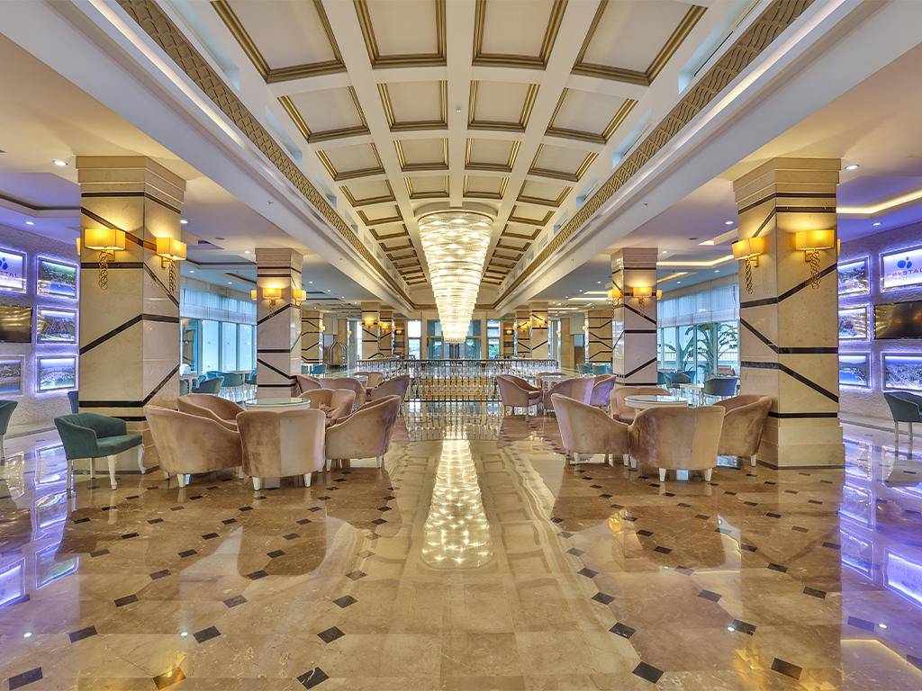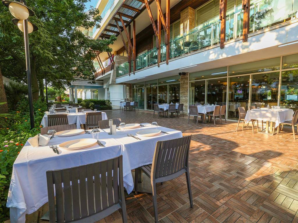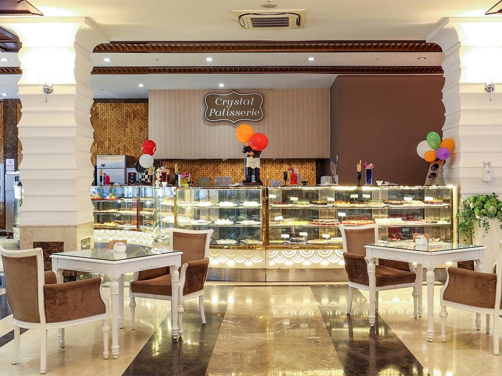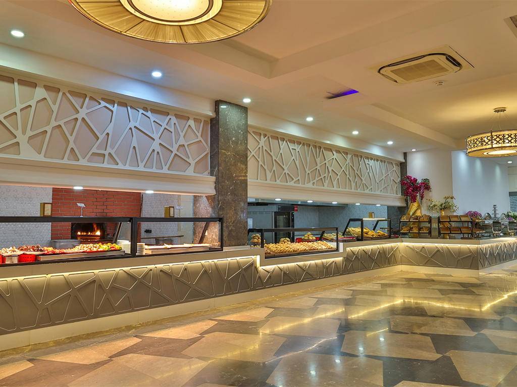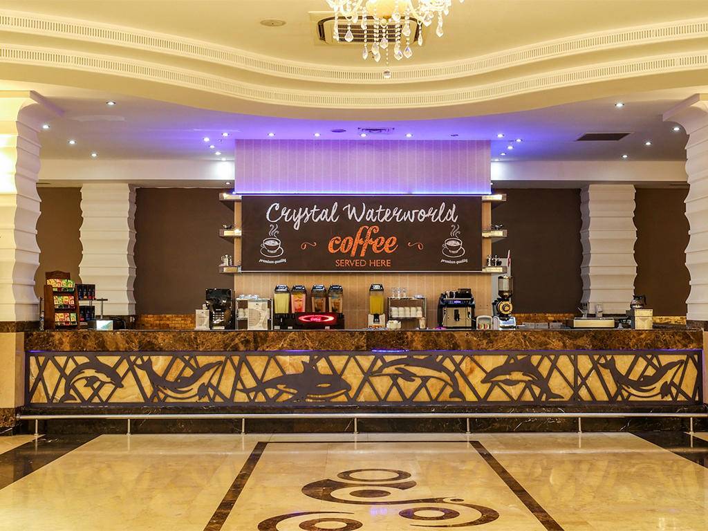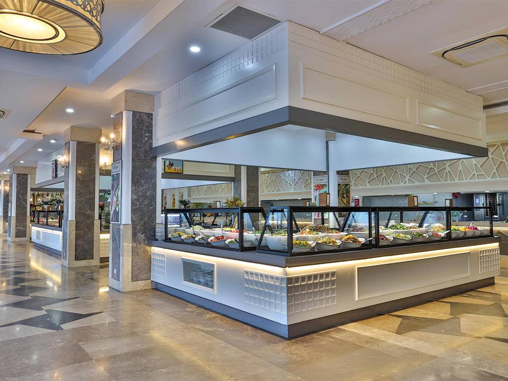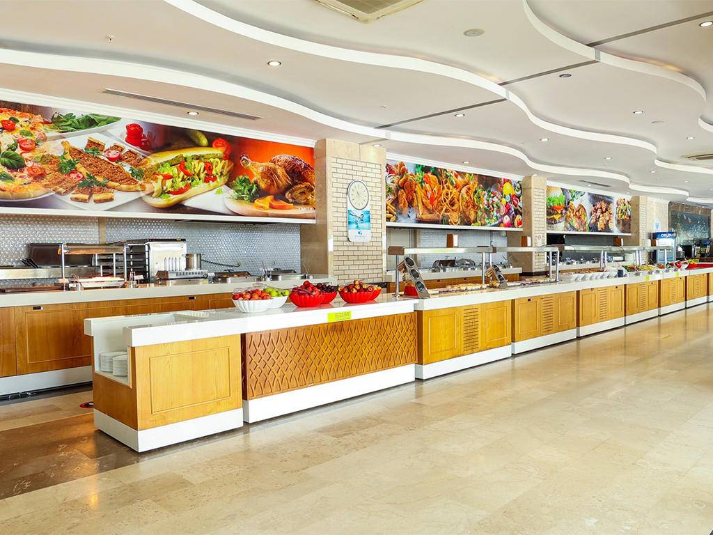Ultimate All Inclusive – 24h usluga hrane i pića. Tursko piće dobrodošlice i peškiri za osvježenje, doručak, produženi doručak, ručak i večera, dijetalni bufe, vegetarijasnki bufe i detox bar, bezglutenski hljeb, specijalni dječiji bufe, i namirnice za pripremu dječije hrane, snack restorani otvoreni tokom dana, A La Carte Restorani ( italijanska, bliskoistočna i turska kuhunja) uvečer, sa rezervacijom unaprijed i jednom tokom boravka, sladoled servis tokom određenih sati, poslijepodnevni kolači, kafa i čaj, barovi po cijelom komplexu, lokalna i standardna uvozna alkoholna i bezalkoholna pića, Crystal Crispy Kids Restoran. Dodatno se plaća: premium alkoholna pića, međunarodna i specijalna vina, rooms servis, svježi voćni sokovi, energetska pića, flaširana pića, A La Carte Restorani: riblji restoran,sva vina, šampanjac, i specijalni obroci naručeni u A La Carte Restoranu ( osim vina).