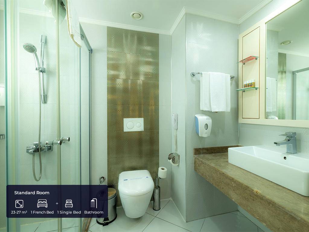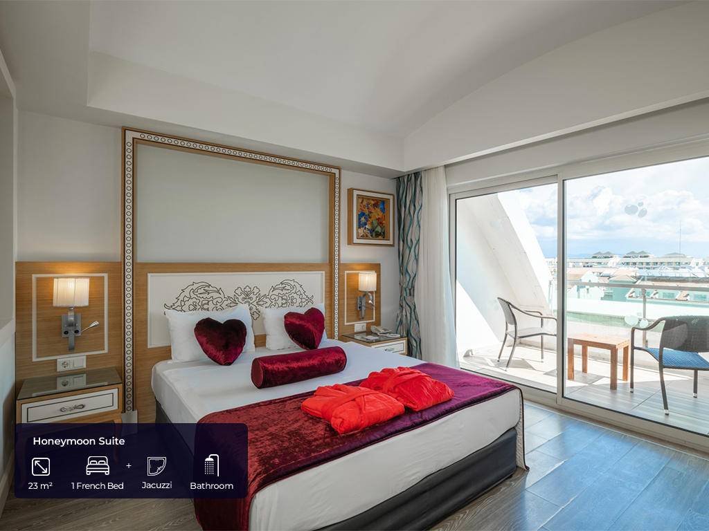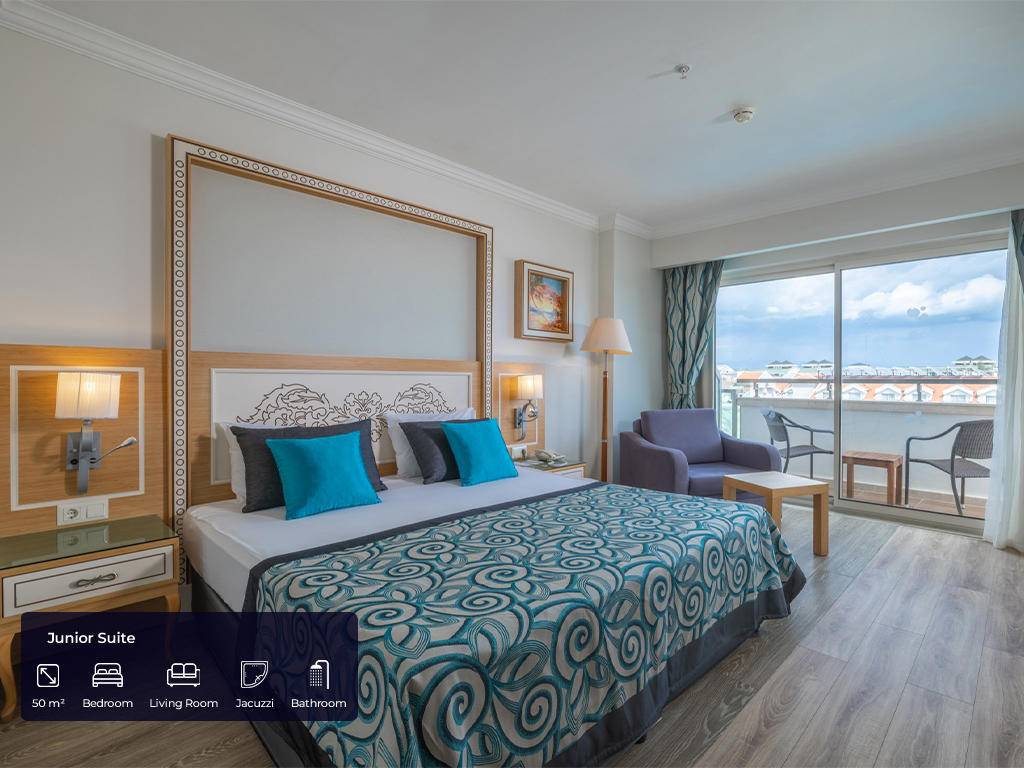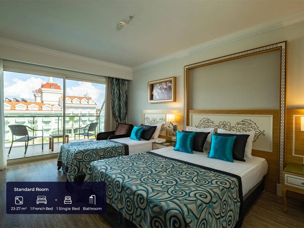 Hotel ima ukupno 1023 sobe, smještene u glavnoj zgradi ( 9 blokova od 5 spratova i 4 bloka od 3 sprata) i 2 Anex bloka ( blokovi od 5 spratova). Standardne sobe ( 27m2, 1 spavaća soba sa francuskim krevetom + 1 single krevet, 1 kupatilo, max. kapacitet 3 pax), Porodična soba ROH ( 33m2, 2 spavaće sobe sa vratima između, francuski krevet u jednoj spavaćoj sobi i kreveti na sprat ili 2 single kreveta, 1 kupatilo, max. kapacitet 3 + 2 pax), Honeymoon apartmani ( 23m2, sa bočnim pogledom na more, 1 spavaća soba, 1 kupatilo, Jacuzzi na širokoj terasi sa ležaljkom), Junior Apartmani ( 50m2, bočni pogled na more, 1 spavaća soba, 1 dnevna soba, 1 kupatilo, velika terasa sa Jacuzzi, max. kapacitet 2 pax). Sve sobe su sa privatnim kupatilom sa tuš kabinom, fenom za kosu, papučama, centralnom klimom koja radi u skladu sa vremenskim uslovima, telefon, mini bar ( gazirana pića – dopunjavaju se svaki dan), set za kafu i čaj, sef, laminatski ili keramički pod, TV sa satelitskim i muzičkim kanalima, internet i balkon.