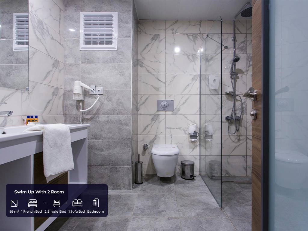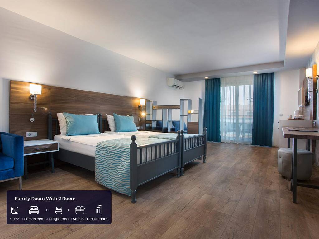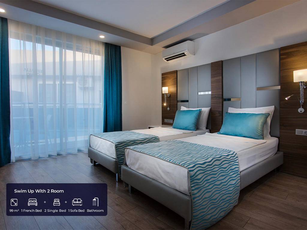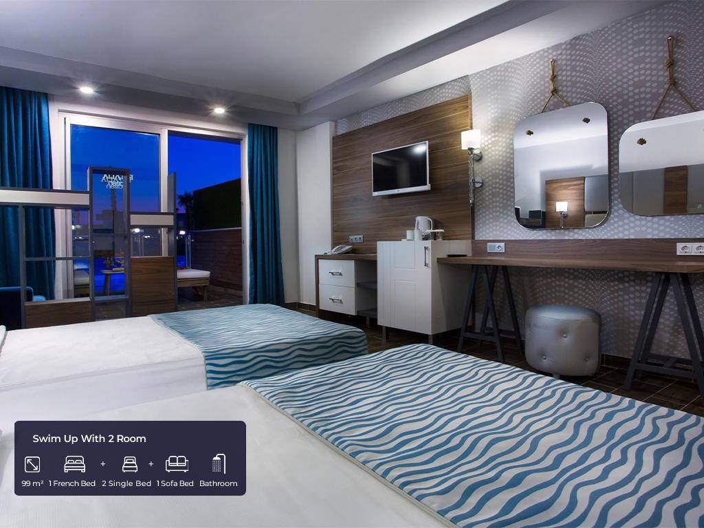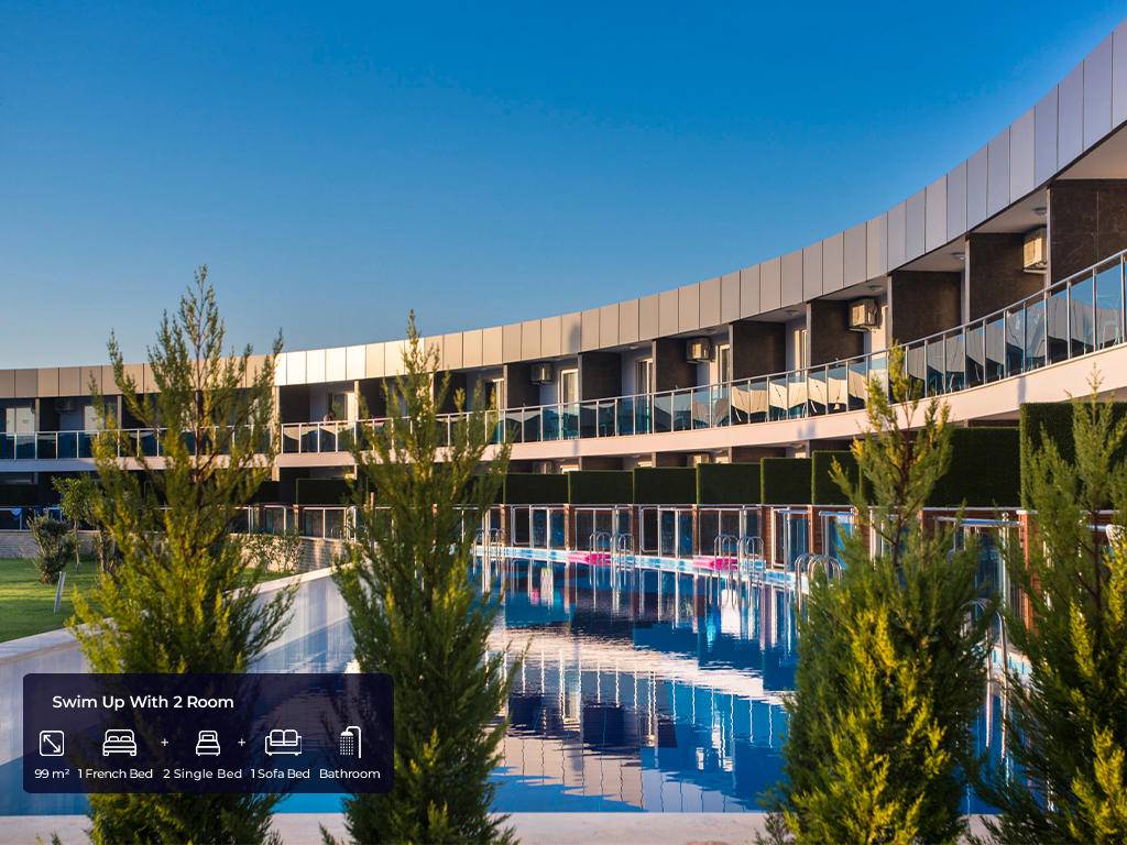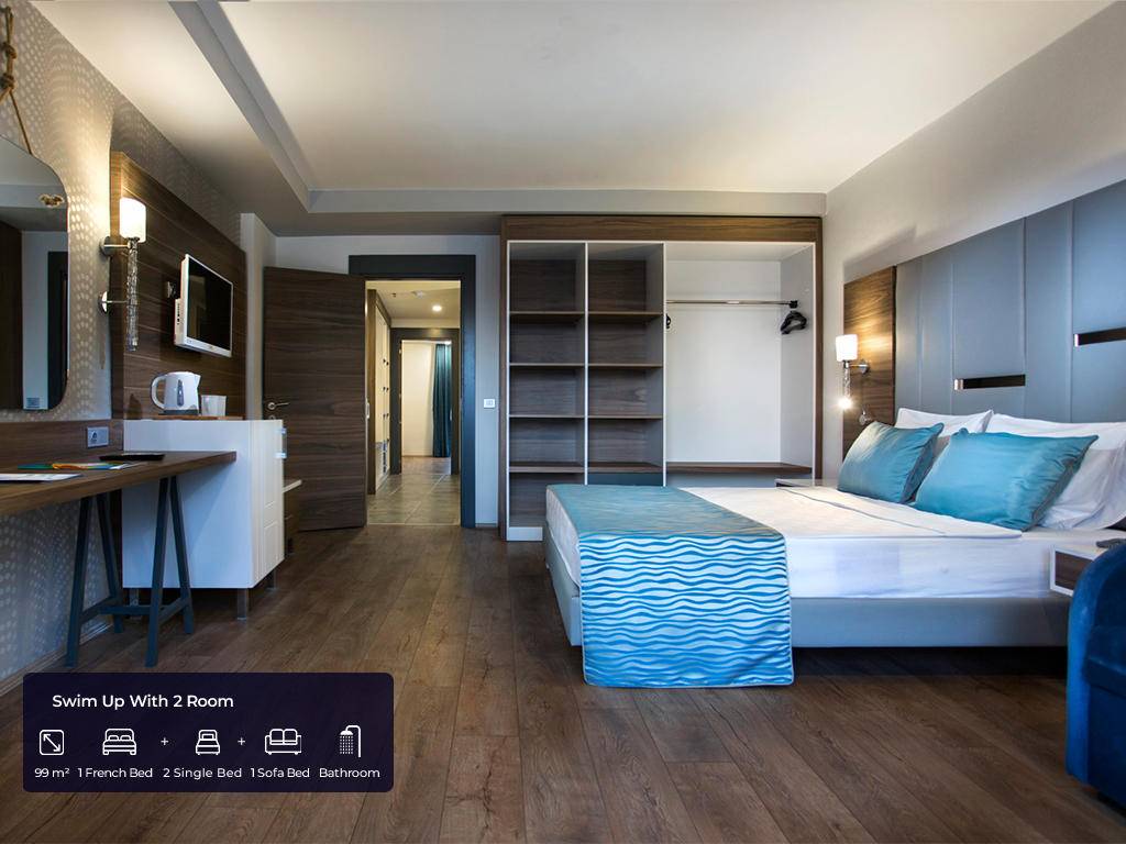 Ukupan broj soba 682 u glavnim zgradama. Standard sobe (35m2, jedna spavaća soba sa francuskim ležajem + jedan krevet za jednu osobu, jedno kupatilo, max.2+1pax), Velike sobe (45m2, jedna velika spavaća soba sa francuskim ležajem, jedan krevet za jednu osobu, jedna fotelja za spavanje, jedno kupatilo, max. 3+1pax), Porodična soba A (91m2, dvije odvojene spavaće sobe, jedna s francuskim ležajem, a druga s tri odvojena kreveta ili dvije fotelje za spavanje, jedna kupaonica, max.4+1pax), Swim up 2 spavaće sobe (99m2, dupleks, dvije odvojene spavaće sobe s jednim francuskim ležajem, 2 kreveta za jednu osobu i jednom foteljom za spavanje, dvije kupaonice, direktan pristup bazenu, max.5+1pax), Swim up s 3 spavaće sobe (113m2, duplex, tri spavaće sobe s jednim francuskim ležajem, četiri kreveti za jednu osobu i dvije fotelje za spavanje, izravan pristup bazenu, dvije kupaonice, max.6+1pax) i 5 soba za osobe s invaliditetom, sve sobe imaju vlastitu kupaonicu s tušem i sušilom za kosu, centralni klima uređaj koji radi prema vremenskim uvjetima , direktna telefonska linija, mini bar (voda i bezalkoholna pića dopunjuju se jednom sedmično), sef, satelitska TV i muzički kanali, balkon.
