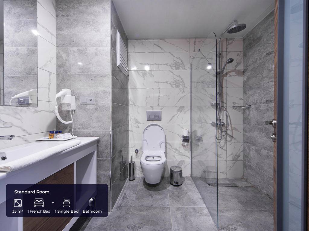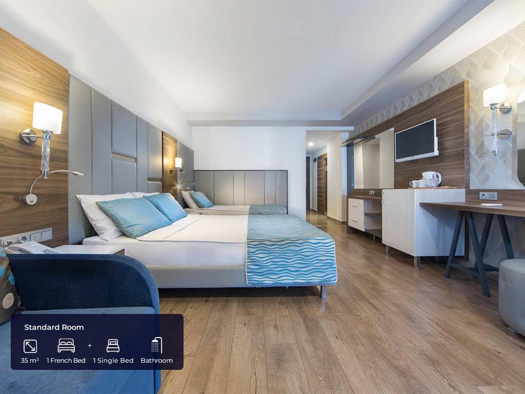 U slučaju rezervacije trokrevetne sobe, popust na treći ležaj je uključen u cijenu i agencija nije u mogućnosti garantovati tri standardna ležaja! Tokom sezone, hotel ima pravo da promjeni neke od sadržaja bez prethodnog obavještavanja.