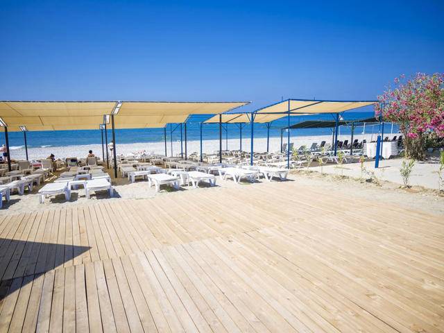 Hotelska privatna peščano-šljunkovita hotelska plaža od hotela Grand Kolibri Prestigel & Spa 5* sa suncobranima, ležaljkama i peškirima koji se ne naplaćuju. Postoji most preko puta koji vodi do plaže.