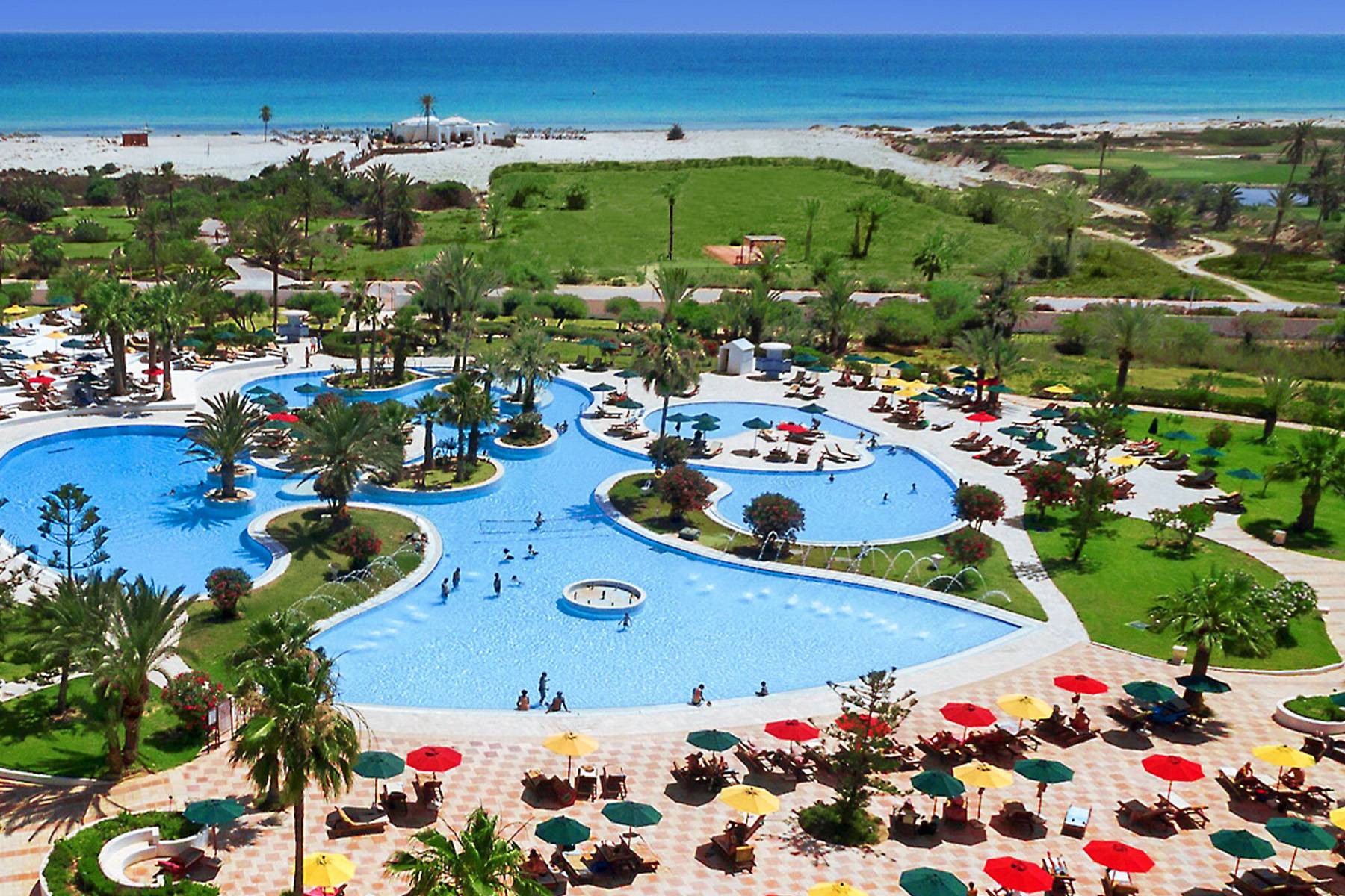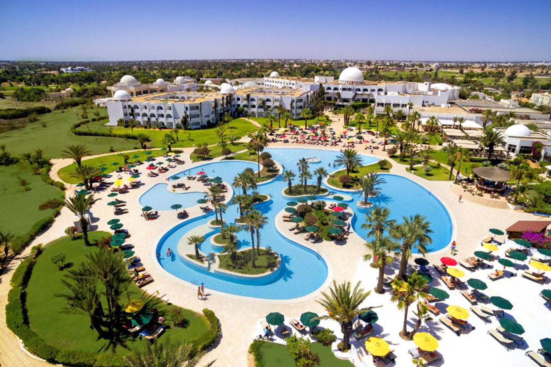 LOKACIJA: Djerba Plaza Thalasso & Spa, dizajniran od strane poznatog tunižanskog arhitekte AJMI MIMITA, smješten na 14 hektara palmine oaze uz more i pješčanu plažu, te okružen golf terenom, pruža jedinstveno iskustvo boravka, bilo da dolazite sami, u paru ili sa porodicom. Hotel je smješten na svega 3 km od turistički poznate regije Midoun, a udaljen je 22 km od internacionalnog aerodroma Djerba-Zarzis.