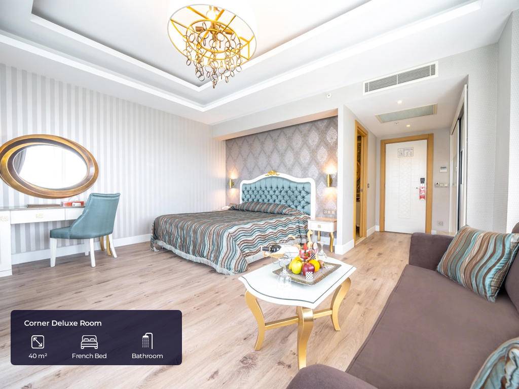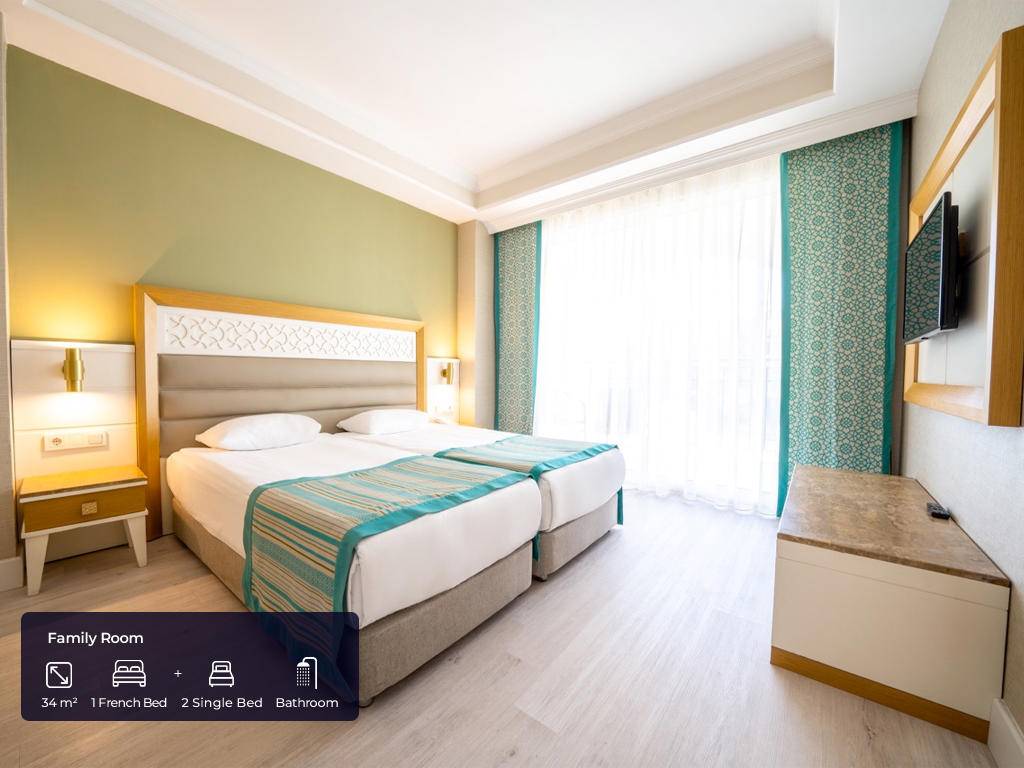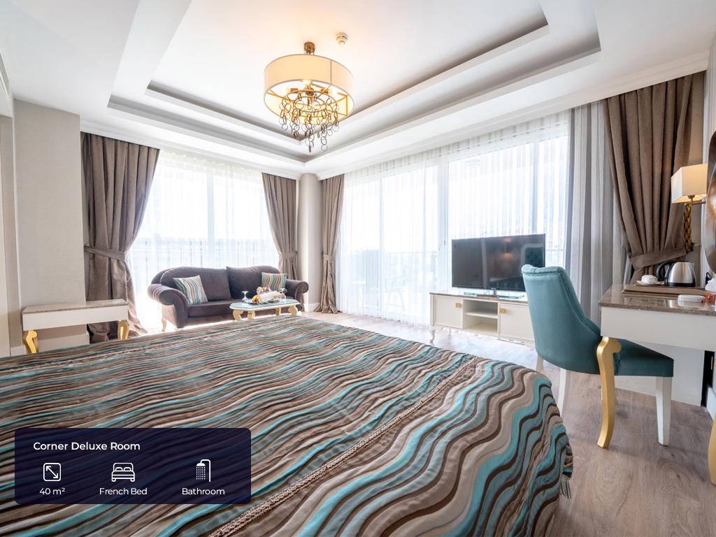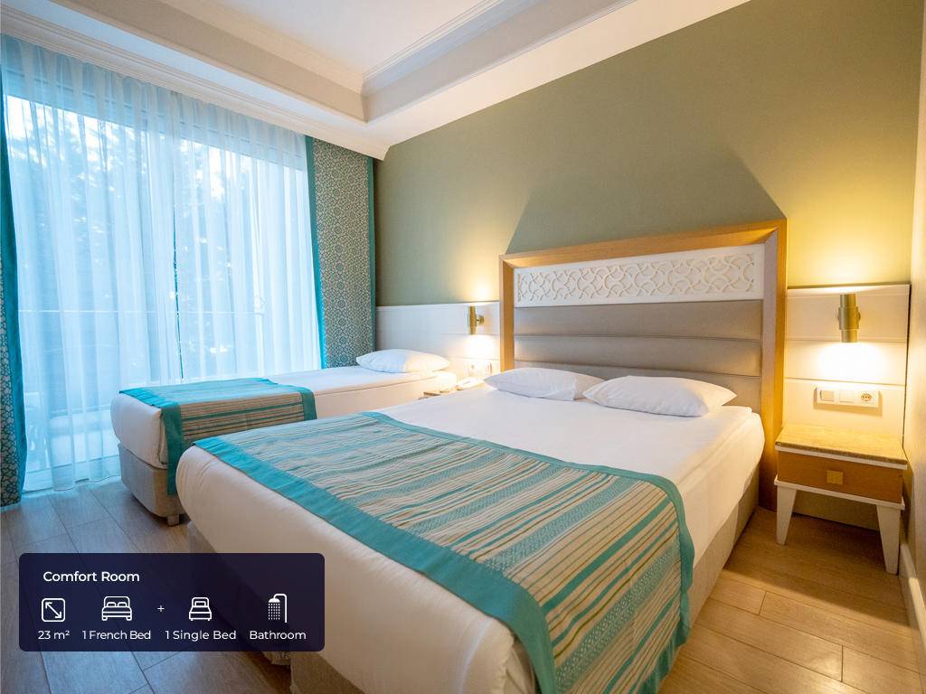 Hotel ima ukupno 297 soba raspoređenih u 3 bloka. Standardne sobe (23m2, jedna spavaća soba sa francuskim ili dva odvojena ležaja + kauč na razvlačenje ili pomoćni ležaj, jedno kupatilo, max.2+1 pax), Family sobe (34m2, dvije spavaće sobe sa vratima između, jedno kupatilo, max.4pax), Comfort sobe (23m2, jedna spavaća soba sa francuskim ležajem + jedan krevet za jednu osobu ili tri single kreveta, jedno kupatilo, postavljen topli napitak, besplatna korpa voća i vina, popust za SPA, A’la Carte restoran, paviljoni, max.3pax), Corner deluxe sobe (40m2, jedna spavaća soba sa garniturom za sjedenje i jednim francuskim ležajem, jedno kupatilo, veliki balkon, besplatan WI- FI, toplo piće, besplatna korpa voća i vino, popust za SPA, A’la Carte restorane, paviljonI, max 2+1chd). Sve sobe imaju: sopstveno kupatilo sa tuš kabinom i fenom, centralnu klimu koja radi u skladu sa vremenskim uslovima, laminat, telefon sa direktnom linijom, mini bar (samo voda po dolasku), sef, SAT TV i muzički kanali i balkon.