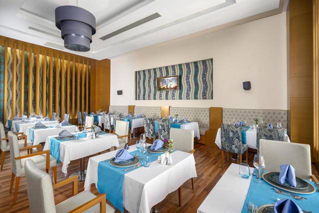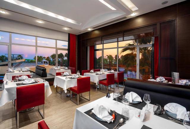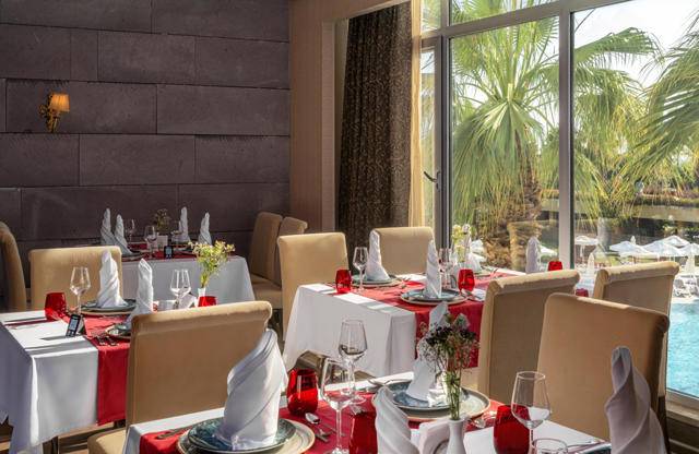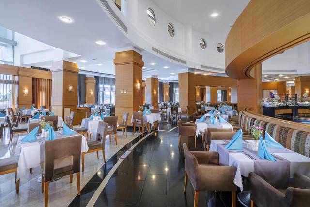 Glavni restoran na otvorenom i u zatvorenom za otvoreni švedski stol, A’la Carte restorani – riblji restoran, Long Horn Ottoman (turska kuhinja), barovi oko hotelskog kompleksa. Liječnik, čuvanje djece, praonica rublja, frizerski salon, shopping centar, telefon, fax, rent a car, internet kutak i računalne igrice su uz doplatu. WI-FI internet je besplatan.