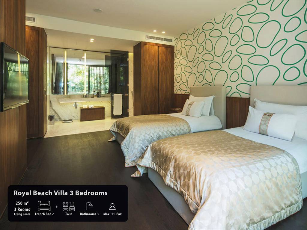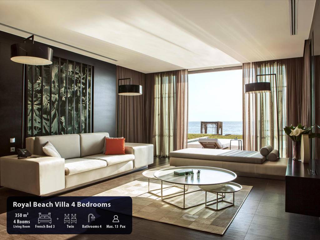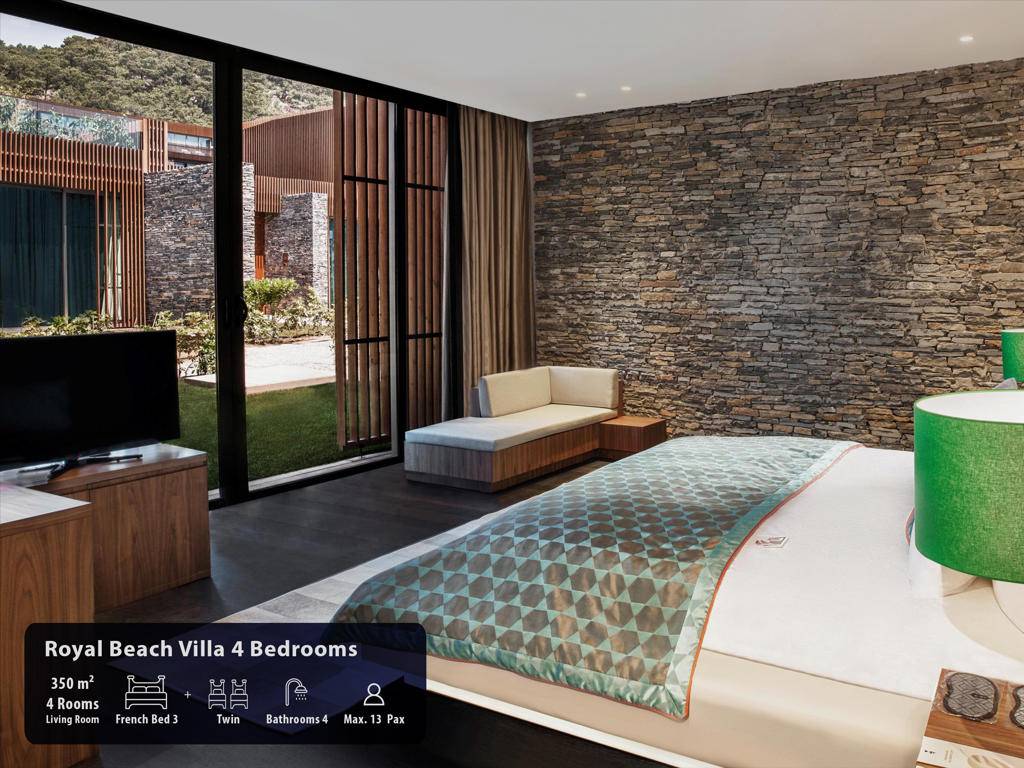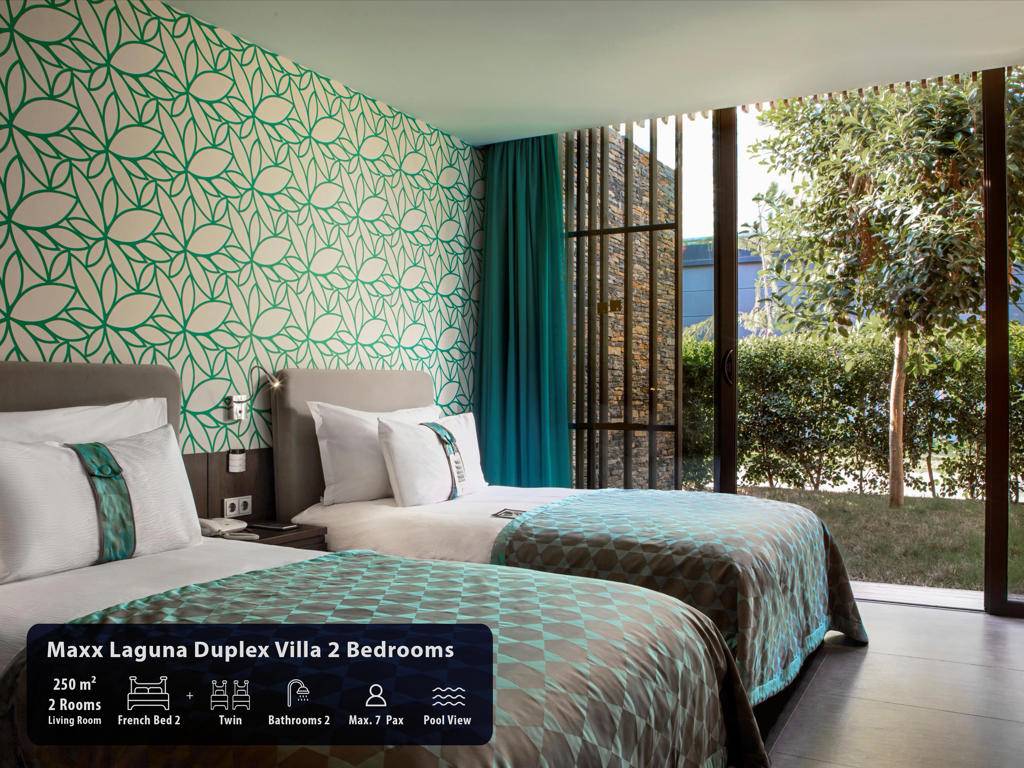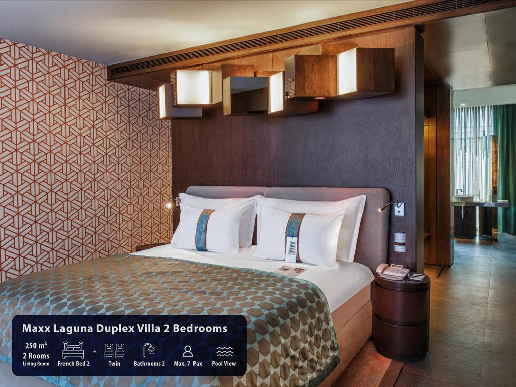 Hotel ima ukupno 291 sobu, smještene u glavnu zgradu, Royal Suit blokove, Laguna i Beach Vila. Maxx Suits: Suit land / Suit Sea (glavna zgrada,pogled na zemljište ili pogled na more, 100m2, prostor za sjedenje, jedna spavaća soba, jedno kupatilo sa đakuzijem, garderoba, max.3pax). Royal Suit Blocks: Royal Suit Family Garden / Sea (185m2 uključujući terasu, Roial Suit blokovi, jedan dnevni boravak, dvije spavaće sobe sa tušem, i velika terasa sa đakuzijem, garderoba, max.6pax + 1inf). Maxx Villas: Maxx Laguna 1 spavaća soba (150m2 uključujući terasu, Laguna apartman, pogled na bazen i direktan pristup bazenu, jedna dnevna soba, jedna spavaća soba, jedno kupatilo sa tuš kabinom, garderoba, terasa sa đakuzijem, max.3+1chd+inf), Maxx Laguna Duplex 2 spavaće sobe (250m2 uključujući terasu, Laguna apartman, dupleks, pogled na bazen i direktan pristup bazenu sa terase, jedna dnevna soba, dvije spavaće sobe, dva kupatila, garderoba, terasa sa đakuzijem, privatna bašta, max.5pax+ 1chd+inf). Maxx Laguna Duplex 3 spavaće sobe (310m2 uključujući terasu, Laguna apartman, dupleks, pogled na bazen i direktan pristup bazenu sa terase, jedan dnevni boravak, tri spavaće sobe sa kupatilom, jedan ulazni hol, garderoba, dvije terase, na poslednjem spratu terasa je đakuzi , privatna bašta, max.10pak+1inf), Beach Villa 3 spavaće sobe (250m2, privatna vila, dupleks, tri spavaće sobe, privatni otvoreni bazen i terasa, dnevni boravak sa otvorenom kuhinjom, ulazni hol, 3 kupatila (glavna spavaća soba sa đakuzijem), terasa sa đakuzijem, sauna, direktan pristup plaži iz bašte, ekskluzivno Kabana na plaži), Beach Villa 4 spavaće sobe (350m2, privatna vila sa otvorenim bazenom, četiri spavaće sobe, glavna spavaća soba sa đakuzijem, dnevni boravak sa otvorenom kuhinjom, tri kupatila, sauna, terasa sa đakuzijem, direktan pristup iz bašte na plažu, ekskluzivna Cabana na plaži), Presidential Villa (450m2, privatna vila sa pogledom na more i privatnim zatvorenim i otvorenim bazenom i terasom, pet spavaćih soba (glavna spavaća soba sa đakuzijem), jedna dnevna soba, jedna trpezarija sa kuhinjom, tri garderobe, 6 kupatila jedno sa đakuzijem, sauna, turska kupatilo, terasa sa đakuzijem, direktan pristup plaži iz bašte, ekskluzivna Cabana na plaži). Sve sobe su luksuzno uređene sa sopstvenim kupatilom sa tuš kabinom i đakuzijem, fenom, ogledalom za šminkanje, bade mantilom, papučama, vagom, telefonom sa direktnim biranjem, split klima sistemom, garderobom sa zaključavanjem, mini barom u Makk Suit sobama i Maki bar u vili Maxx, WI-FI internet, set za čaj i kafu, sef, LCD TV, satelitski programi, raspremanje kreveta, voće i cvijeće po dolasku.