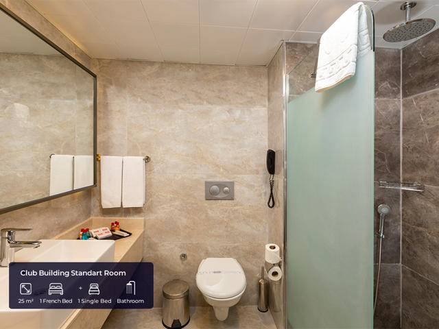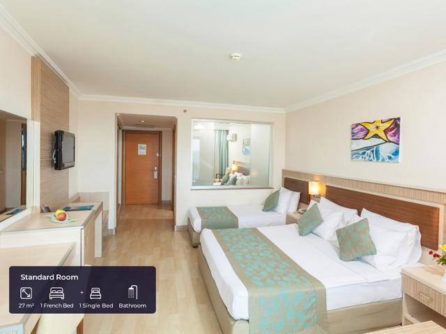 Ukupan broj soba – 372 raspoređene u glavnoj zgradi, jednoj club zgradi i u dvije annex zgrade (postoji prolazni tunel dug 37m koji povezuje glavnu sa club zgradom). Standardna sobe u glavnoj zgradi (27m2, jedna spavaća soba, kupatilo, max2+2chd), ekonomi sobe u annex dijelu (21m2, nalaze se u annex dijelu, spavaća soba, kupatilo manje nego u standardnim sobama, max 2+1 pax), club standard soba (25m2, spavaća soba sa francuskim krevetom + jedan single krevet, kupatilo, max 2+2pax , novi blok izgrađen u 2019), club porodične sobe (31m2, dvije odvojene spavaće sobe, jedno kupatilo, max 4 pax, novi blok izgradjen 2019), terrace jacuzzi sobe (51m2, smještene u glavnoj zgradi, soba 27m2 + terasa 24m2 sa jacuzzijem, spavaća soba, kupatilo, max.2+2chd). Sve sobe imaju: kupatilo sa tušem, fen, split klima sistem, satelitsku TV i muzičke programe, direktna telefonska linija, mini bar (bezalkoholna pića po dolasku, a poslije samo voda se dopunjuje), kuhalo, set za kafu i čaj, sef (uz doplatu), laminat i balkon.