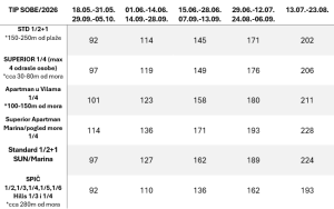 Cijene u tabeli su izražene u KM, po osobi, po noći na bazi ALL inclusive usluge za 2026 godinu: