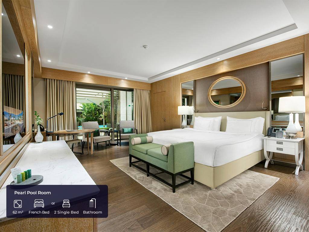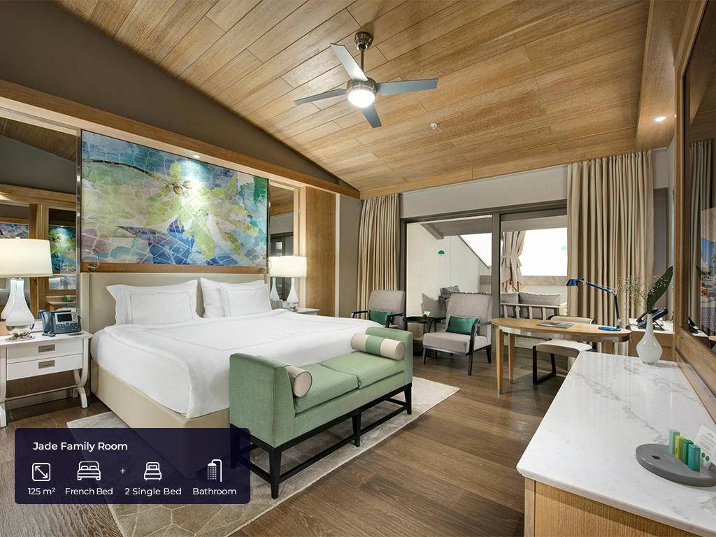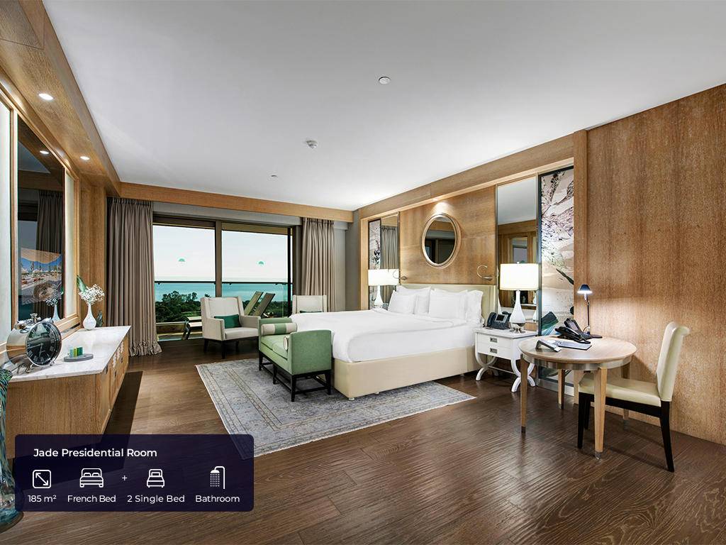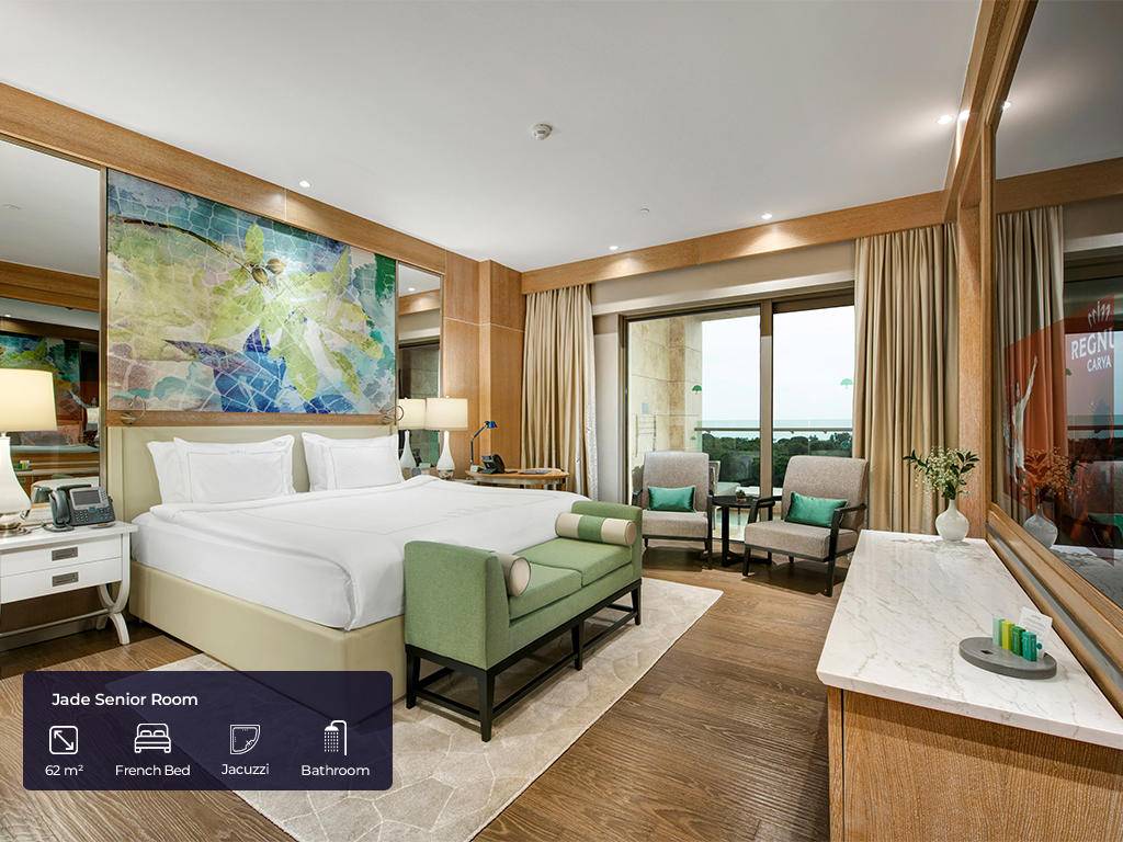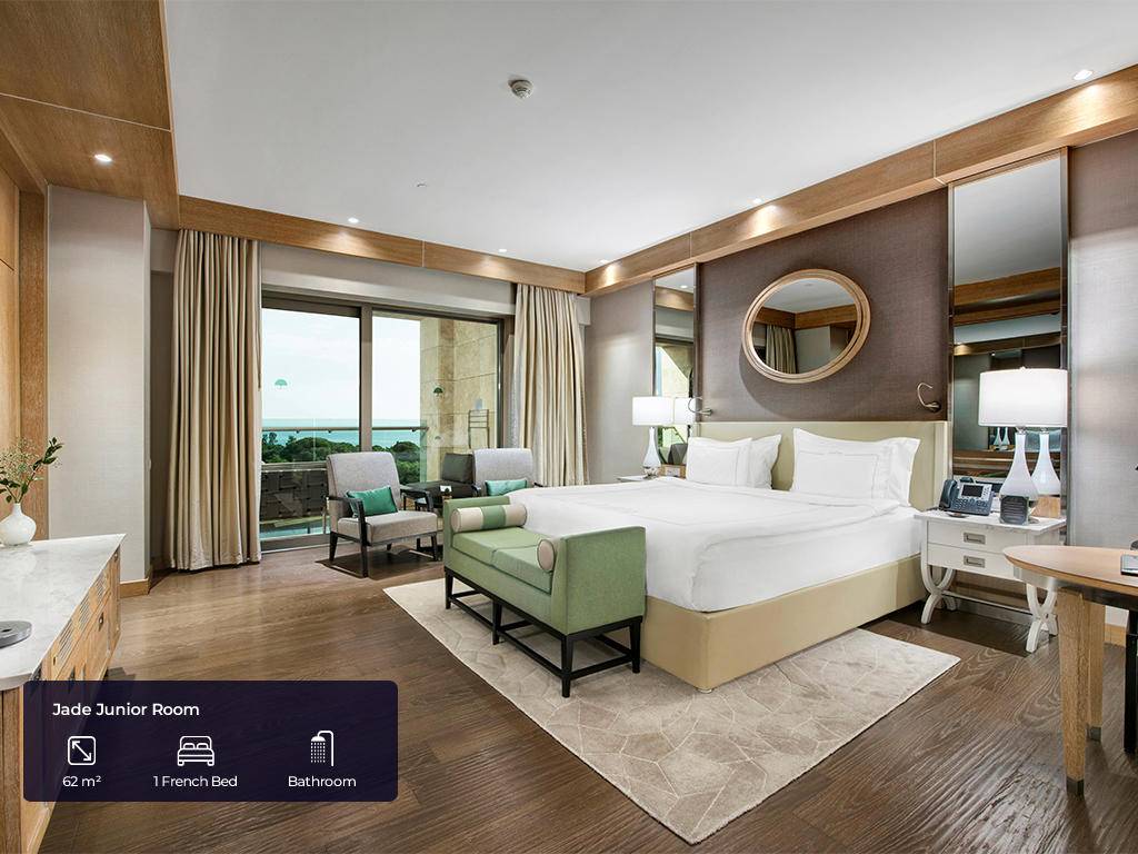 Hotel ima ukupno 553 soba. Jade sobe (62m2(zajedno sa balkonom), max. 3+ 1inf, glavna zgrada, jedna spavaća soba, jedno kupatilo sa tuš kabinom i kadom, dio za sjedenje, radni stol, garderoba, balkon, pogled na golf dvorište, bočni pogled na more ili direktan pogled na more), Jade apartmani (124m2 (zajedno sa balkonom), glavna zgrada, pogled na more, jedna spavaća soba, jedna dnevna soba sa prostorom za sjedenje i radnim stolom, dva kupatila, garderoba, max.3pax+ 1chd), Jade family (85m2 + 40m2 terasa, glavna zgrada, dvije spavaće sobe, prostor za sjedenje, radni stol, dva kupatila sa tušem i kadom, max.4pax+1chd), Pearl pool sobe (62m2 (zajedno sa terasom), pored golf terena, kupalište sa bazenom od 140m2 koje dijeli sa drugim sobama, jedna spavaća soba, jedno kupatilo, dio za sjedenje, radni sto, garderoba, max.3+1chd), Pearl porodični bazen (100m2 + terasa 24m2, pored golf terena, kupalište sa bazenom 140m2 koje dijeli sa još jednom sobom, dvije spavaće sobe, dva kupatila, dio za sedenje, radni sto, garderobe,max.6+1chd), Pearl pool apartman (100m2 + 24m2 terasa, pored golf terena, bazen od 140m2 koji se dijeli sa drugom sobom, jedna spavaća soba, dva kupatila, jedan dnevni boravak, radni stol, garderoba, max.3+1chd). U svim sobama gosti mogu pronaći bade mantil, papuče, sef, garderober koji se zaključava, čajnik, aparat za kafu i čaj, Nespresso aparat za kafu, WI – FI internet, mini bar (voda, bezalkoholna pića, pivo, voćni sok, mlijeko, čokoladni vafl koji se dopunjuju svakog dana), u apartmanskim sobama maksi bar (sa alkoholnim pićima), direktna linija telefoni, klima uređaj, ogledalo LED TV u sobi sa raznim međunarodnim programima, sopstveno kupatilo sa tušem i odvojenom kadom i toaletom, garderoba, izbor jastuka.