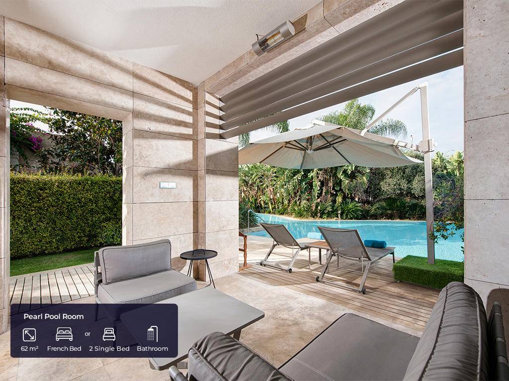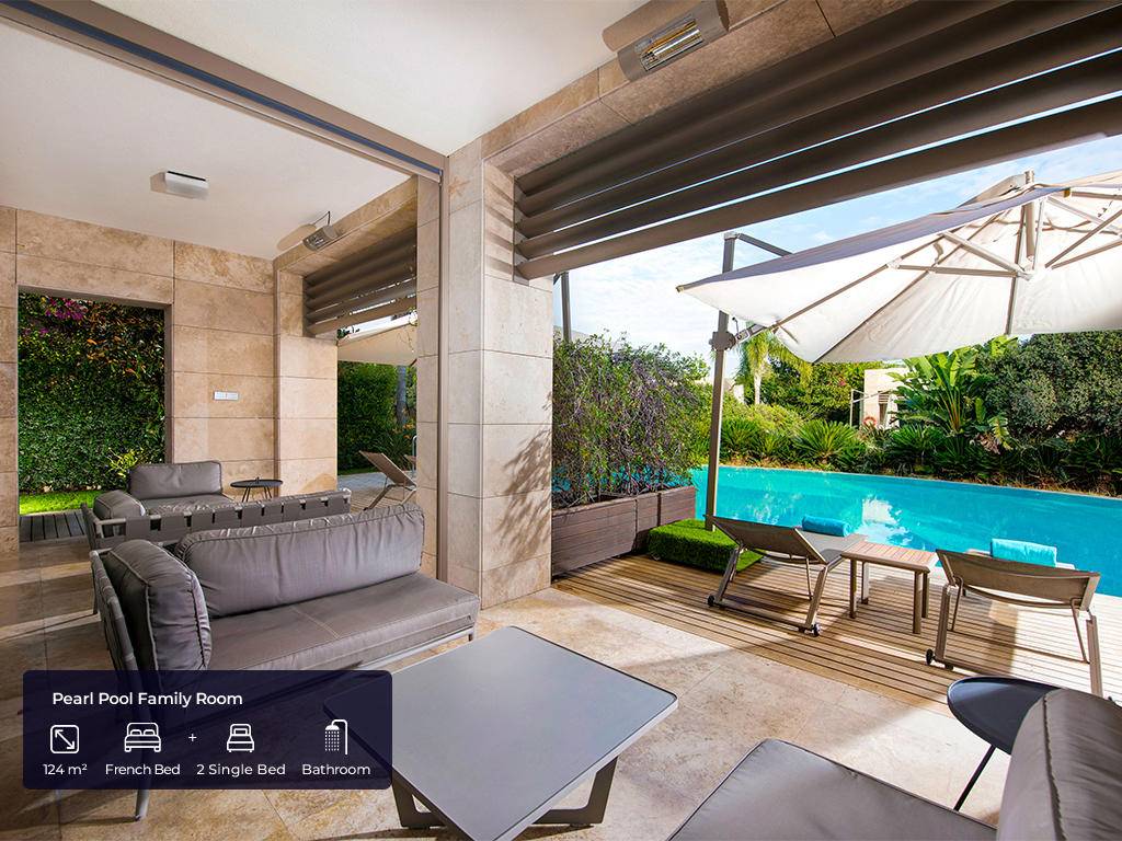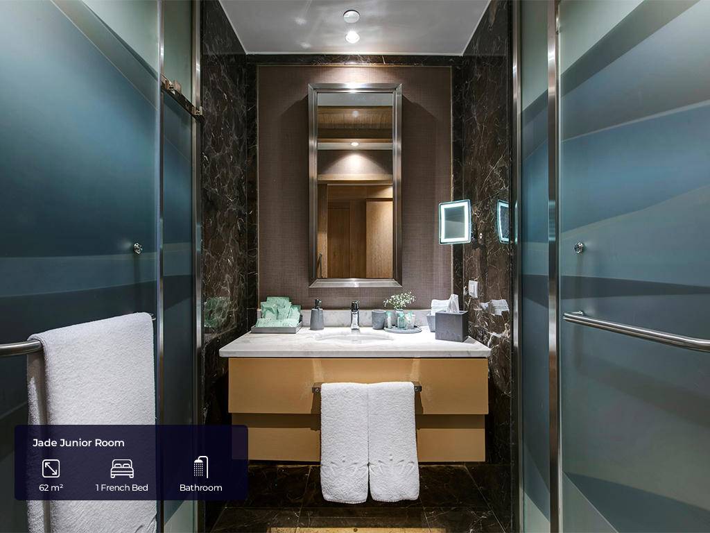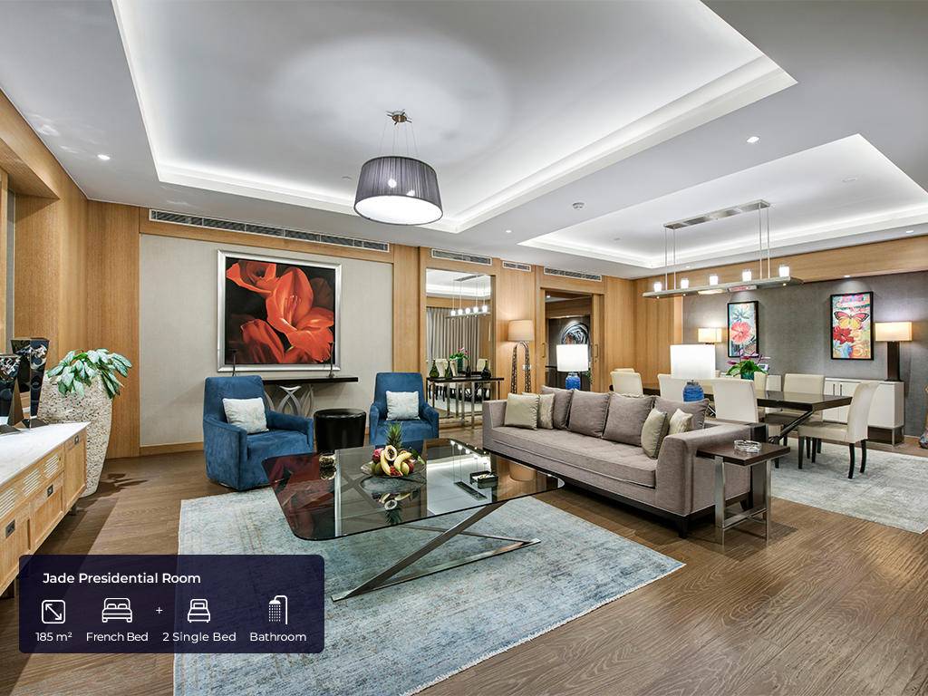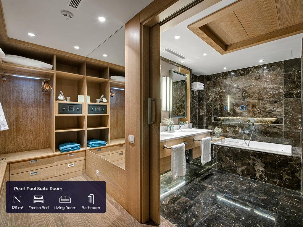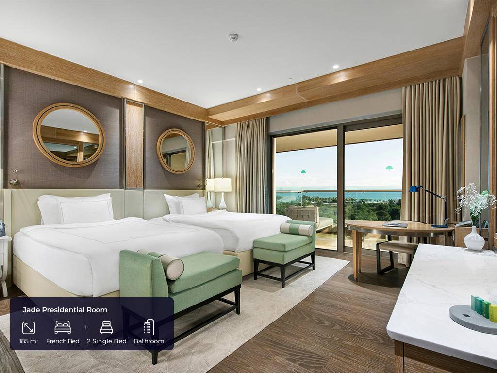 Hotel ima ukupno 553 soba. Jade sobe (62m2(zajedno sa balkonom), max. 3+ 1inf, glavna zgrada, jedna spavaća soba, jedno kupatilo sa tuš kabinom i kadom, dio za sjedenje, radni stol, garderoba, balkon, pogled na golf dvorište, bočni pogled na more ili direktan pogled na more), Jade apartmani (124m2 (zajedno sa balkonom), glavna zgrada, pogled na more, jedna spavaća soba, jedna dnevna soba sa prostorom za sjedenje i radnim stolom, dva kupatila, garderoba, max.3pax+ 1chd), Jade family (85m2 + 40m2 terasa, glavna zgrada, dvije spavaće sobe, prostor za sjedenje, radni stol, dva kupatila sa tušem i kadom, max.4pax+1chd), Pearl pool sobe (62m2 (zajedno sa terasom), pored golf terena, kupalište sa bazenom od 140m2 koje dijeli sa drugim sobama, jedna spavaća soba, jedno kupatilo, dio za sjedenje, radni sto, garderoba, max.3+1chd), Pearl porodični bazen (100m2 + terasa 24m2, pored golf terena, kupalište sa bazenom 140m2 koje dijeli sa još jednom sobom, dvije spavaće sobe, dva kupatila, dio za sedenje, radni sto, garderobe,max.6+1chd), Pearl pool apartman (100m2 + 24m2 terasa, pored golf terena, bazen od 140m2 koji se dijeli sa drugom sobom, jedna spavaća soba, dva kupatila, jedan dnevni boravak, radni stol, garderoba, max.3+1chd). U svim sobama gosti mogu pronaći bade mantil, papuče, sef, garderober koji se zaključava, čajnik, aparat za kafu i čaj, Nespresso aparat za kafu, WI – FI internet, mini bar (voda, bezalkoholna pića, pivo, voćni sok, mlijeko, čokoladni vafl koji se dopunjuju svakog dana), u apartmanskim sobama maksi bar (sa alkoholnim pićima), direktna linija telefoni, klima uređaj, ogledalo LED TV u sobi sa raznim međunarodnim programima, sopstveno kupatilo sa tušem i odvojenom kadom i toaletom, garderoba, izbor jastuka.