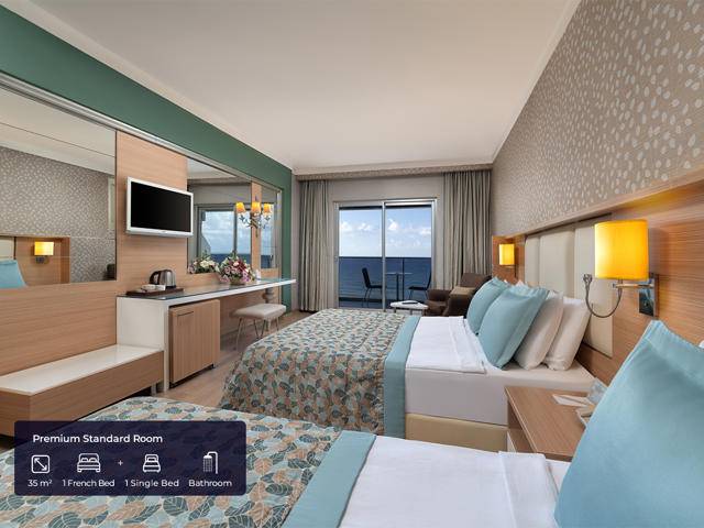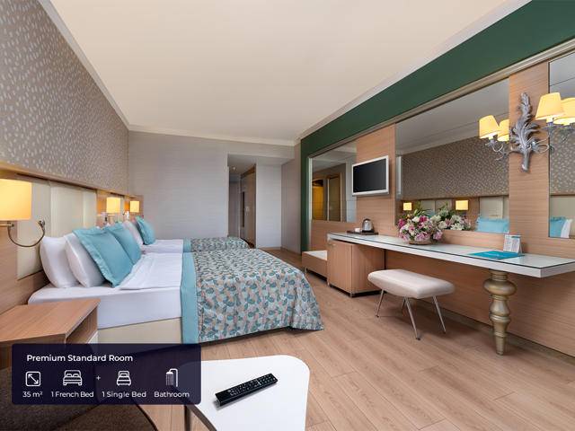 Ukupan broj soba 419 u tri objekta.Standardne sobe ROH (20m2, jedna spavaća soba, jedna kupaonica, max.2pax), Premium standardne sobe (35m2, jedna spavaća soba, jedna kupaonica, max.3+inf), Porodične sobe 1 (42m2, glavna zgrada, jedna spavaća soba i jedan dnevni boravak) soba s dva kauča na razvlačenje, jedna kupaonica, max.3+1chd), obiteljske sobe 2 (42m2, smještene u bočnoj zgradi koja se nalazi prekoputa ispred glavne zgrade, jedna spavaća soba, jedan dnevni boravak, jedna kupaonica, max. .3+1chd). Sve sobe imaju vlastitu kupaonicu s tuš kabinom i sušilom za kosu, split klima sustav, mini bar (voda, bezalkoholna pića dopunjuju se svaki dan), kuhalo za vodu, čaj i set za kafu , sef, pod laminat ili keramika, WI-FI internet veza, satelitska TV i muzički kanali, balkon.