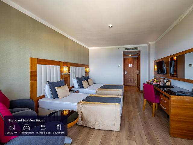 Hotel ima ukupno 264 soba. Superior sobe (25-35m2, spavaća soba sa bračnim krevetom ili dva odvojena kreveta + sofa (3pax), kupatilo, max.2+1pax), Family sobe (60m2, dvije spavaće sobe sa bračnim krevetom ili dva odvojena kreveta, kupatilo, max.4pax) dvije sobe su prilagođene osobama sa invaliditetom. Sve sobe imaju kupatilo sa tuš kabinom, fen, papuče, centralna klima, laminat na podu, telefon, mini bar (voda i bezalkoholna pića pri dolasku, voda se dopunjava svaki dan), sef, satelitska TV sa muzičkim programima. WI-FI internet je besplatan. Hotel je renoviran 2023 godine.